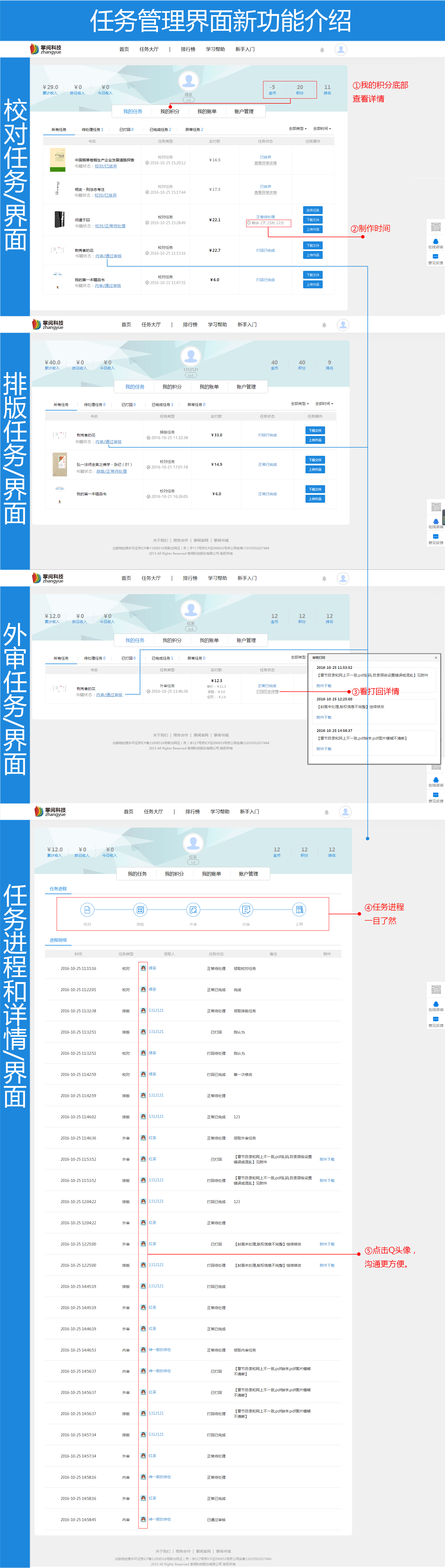 结合了很多用户觉得联系下游或者上游用户没有一个良好的途径,造成的沟通不畅快; 任务进行到什么流程,还要多长时间,这本书可以上线也不明了; 备注写的不清楚,我还想进一步问一些问题,无处可询等等~ 设计了此次界面,它摒弃了之前的罗列信息,将信息整合划分为几个模块,让大家快速找到重要信息,突出了任务进程界面,用户只需点击任务状态,即可清晰看到任务进程,从此清晰明了,真是不能再爽了。 ------------ 最最重要的是,费劲巴拉做完任务,你的上游用户放弃了,蓝瘦~香菇~的情绪只能自己安抚,BUT,现在不怕了哟~ <div align=center></div> <font color=#0099CC>校对排版流水线:校对任务+排版任务+外审+内审 四个人领取,如果其中校对不堪重负放弃了任务,系统会自动并发出校对任务,等待下一个人来领取此校对任务替补之前的人,流水线不会因此断裂。 如果排版用户放弃了,那么我们会判断此用户是否上传过作品,上传过,我们会发到一个**捡漏专区**,同志们还可以按任务原价领取,但是制作难度从理论上来说,要比重新做简单多了。</font> ------------ 废话不多说,小伙伴不管你是校对、排版还是外审的小伙伴,都来看看吧~ <div align=center></div>