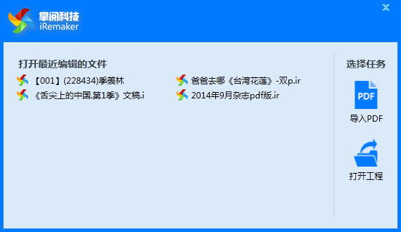 # 导入PDF 1、点击右侧“**导入PDF**” 按钮。 2、选择需要制作的书籍的PDF文件,点击“**打开**”,工具即开始自动对该PDF进行解析分析重组,然后进入软件主界面。 3、导入的PDF由iRemaker自动在安装目录下的“Data --> Project”文件夹下创建同名工程文件文件夹。 4、一个工程文件夹为一个整体,不可随意删除内部文件,否则会导致工程文件无法正常打开。 5、工程文件夹结构为:“Epub”(epub存储文件夹)、“Origin”(原始解析数据及PDF文件存储文件夹)、“Temp”(即时数据存储文件夹)、“书名.iremaker”(打开工程时需选择的文件)。   # 打开工程 1、点击右侧“**打开工程**” 按钮。 2、选择需要打开的书籍工程文件夹中的.iremaker文件,点击“打开”,工具即开始读取该工程文件的数据,然后进入软件主界面。  3、打开工程文件并不改变其位置,也不会将工程文件拷贝至软件安装目录下,此点需要注意,防止误删文件。 # 打开最近编辑的文件 直接点击想要打开的书籍,即可直接打开该书籍的工程。