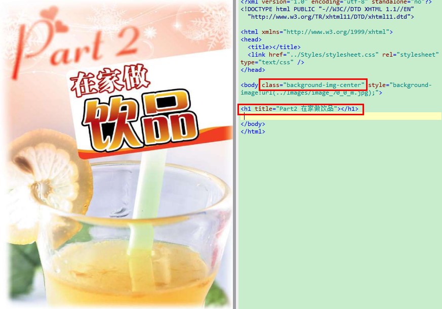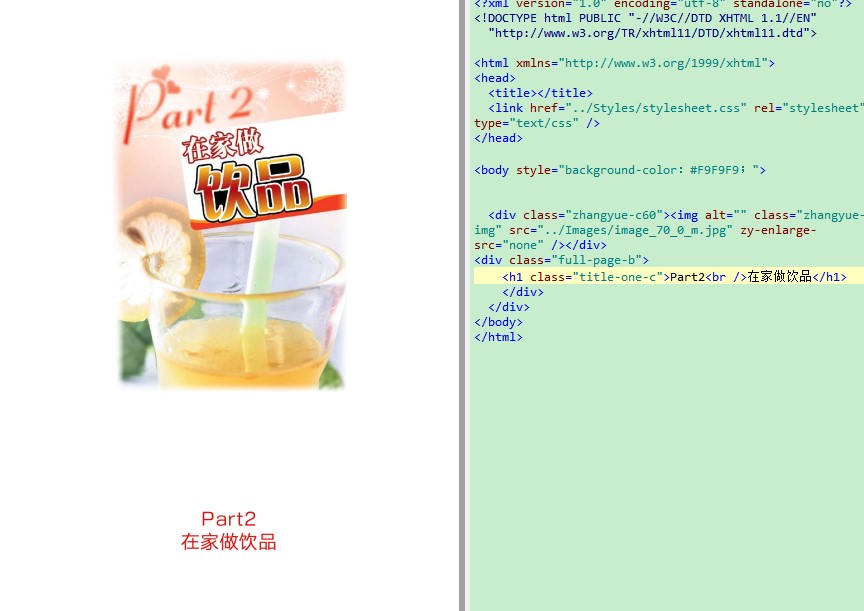 ##### 像这种标题是图片的,我们再写一个标题就感觉有点多余了,但是为了提取标题,又不得不写,下面我来讲一下怎么处理这类的问题。  ##### 首先,我们把这张图片设置成全屏页,会用到`class="background-img-center"`这个样式,样式表里有,直接调用就好。 ##### 为了提取方便,又不让文字在文中显示,我们把标题名写进title里`<h1 title="Part2 在家做饮品"></h1>`,看下效果,是不是比之前的好很多!