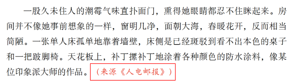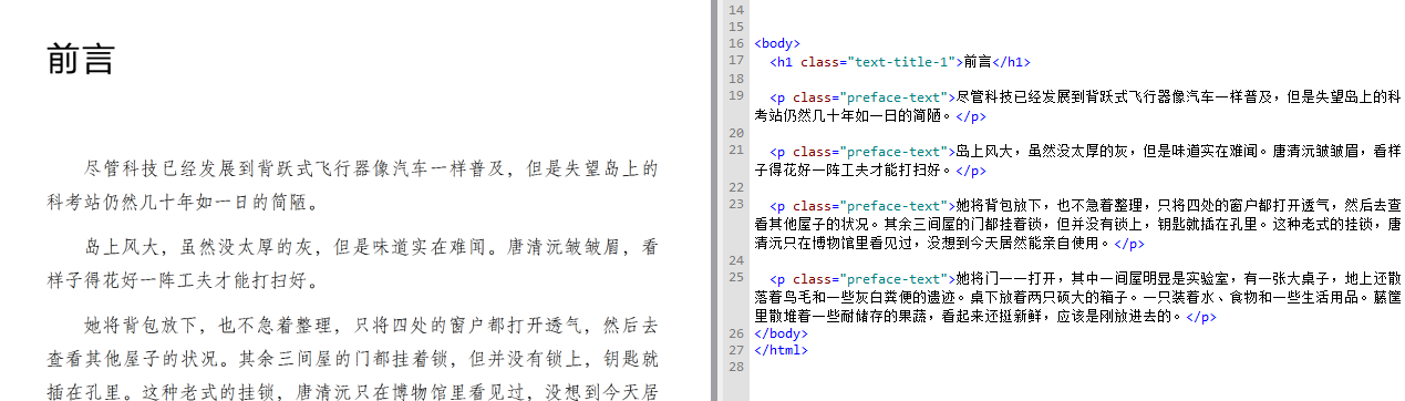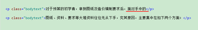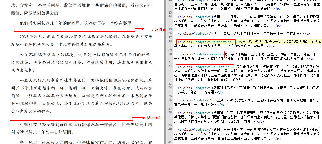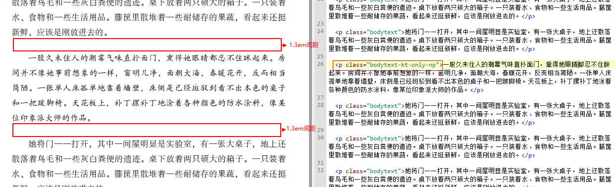 ### 一、正文段落默认正文段落的标签`<p class="bodytext">`它的字体样式兰亭黑(这个需要注意),且这个class的里面代码不要有任何更改(下面是默认正文段落的代码,审核的时候只需要大概看一下是否为默认样式即可)<div align=center></div>### 二、刷版(除默认正文段落以外的其他样式)<font color=#FF0000>在检查刷版的时候,要看刷版是否正确、有无漏刷的情况</font>###### 1.序言后记段落序言后记段落的标签`<p class="preface-text">`一般前言、序言、后记都要刷这个样式<div align=center></div>###### 2.楷体段落楷体段落的标签`<p class="bodytext-kt-np">`<font color=#FF0000>有刷版段落的时候,为了使层次更加明显,一般正文和楷体段落之间会有一个1.3em的间距</font><br/><div align=center></div><br/><div align=center></div>###### 3.诗歌诗歌的标签:居左`<p class="poem-left">`居中`<p class="poem-center">`诗歌也要注意和正文的上下间距| <div align=center></div> | <div align=center></div> || ------------ | ------------ || | |###### 4.落款落款标签`<p class="inscribed-right">`多个落款之间用软回行<div align=center></div>###### 5.书信样式书信标签`<p class="inscribed-left">`书信开头的样式一般是不缩进的,多个书信开头之间也用软回行<div align=center></div>###### 6.行内样式行内标签`<span>`行内样式一般是行内换字体、颜色、字号行内的刷版一般根据原pdf来刷版<div align=center></div><div align=center></div><div align=center></div>###### 7.zy样式在iremaker识别出来的样式,导到排版工具中会带一些-zy的样式考虑到zy开头的样式不规范,建议把zy开头的样式的批量替换成css的默认样式或自己新建样式,如下图<div align=center></div><br/><div align=center></div>###### 8.特殊样式**(1)角标**<div align=center></div>**(2)注释或弹出**(<a style="text-decoration:none;" href="http://other.d.ireader.com/group8/M00/07/5B/wKgHiVfFLXOEHNr-AAAAADGSUdU241639067.zip?v=dpftvW4Z">注释和弹出的小图下载 <img src="/static/images/download.png"/></a>)<font color=#FF0000>审核的时候要注意注释里面是否有多余的数字符号和注释前后是否有空格</font>弹出一般用在篇章页的段落(多是独段)为了不掉页,题记内容为单个段落且在pdf上展示不超过4行,将题记内容与标题一同放在篇章页(文字长的部分可以用“ ”弹出的形式展示);图注太长的话,也会使用弹出| <div align=center></div> | <div align=center></div> || :------------: | :------------: || 注释 | 弹出 |**(3)多余span**除正常需要刷版的行内样式外,其他多余的span要删除<div align=center></div>**(4)硬回车(段落非正常结尾)**硬回车查找的方法: ● 先在查找对话框里输入`<p class="bodytext">.*[^。……!?——:”>]</p>` ● 然后模式选正则表达式 ● 最后点击查找(依次点击查找按钮,直到这本书的所有内容查找完毕) <div align=center></div>**查找出来的内容是不一定全是段落硬回车,一定要对照pdf看段落是否是硬回车**下面这两个图都是用正则式查找出来的, 很明显,左边的图是没有问题的,右边的图就是硬回车,没有正常结尾| <div align=center></div> | <div align=center></div> || :------------: | :------------: || 正常段落 | 硬回车 |**(5)中英文标点使用是否正确**<div align=center></div>**(4)不规则刷版**