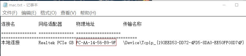 `开始--》运行 --》 cmd --》getmac -v > d:\mac.txt` ------------ 运行(win+r) <div align=center></div> ------------ 输入这段代码,然后点回车 <div align=center></div> 去D盘,找到mac.txt这个文件,打开,红框标注的物理地址就是要找的,如果有多个的话,都要发给管理员。 <div align=center></div> <div align=center></div>