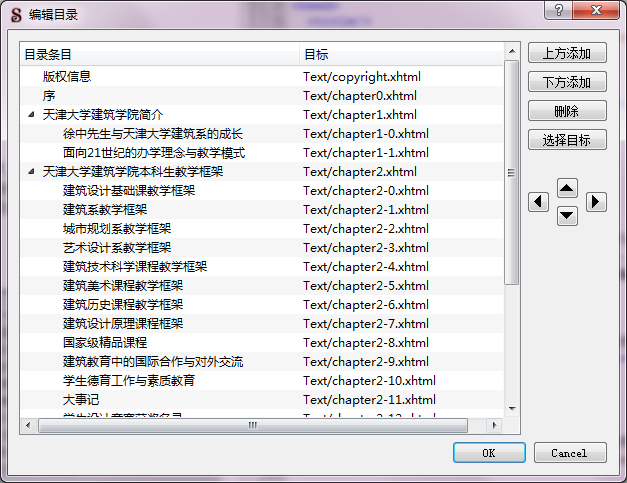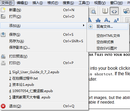 <font color=#3399FF>打开文件/保存文件 目录编辑 图片、视频、音频 HTML文档的拆分和合并</font><br /> 在对sigil的界面和界面上的各个部分有了简单的了解之后,接下来将要介绍的是sigil的基本功能。这些功能会在排版的过程中频繁使用,学会这些功能之后会使排版更加应用的更加熟练。 # 一、打开文件/保存文件 ##### 1、打开文件 用epub打开文件的方法有很多种,最常用的两种,一种是点击工具栏**打开文件按钮** ,或者通过**“文件——打开”**,或者使用快捷键**“Ctrl+O”**在电脑中选择需要打开的文件。 <div align=center></div><br /> <div align=center></div><br /> Sigil可以打开epub文件、HTML文件和文本文件,就是常说的txt格式的文件。 当Sigil打开epub时,epub中的文件都会自动加载,如HTML文件,图像,样式表等等;Sigil打开HTML文件时,HTML文件,链接的其他文件和样式表都会被导入到Sigil中。 在打开这两种格式的文件时,sigil会依据之前在首选项的设置,显示设置的内容;sigil还会同时清理文件中错误的代码,并对修改过后仍有问题的代码发出警告 当sigil打开文本文件时,则是直接将TXT文件转换成了HTML文件。 ##### 2、添加HTML文件/空白HTML文件 这里添加文件要保证为epub调用,所以采用了从图书浏览器添加文件。 (1)在图书浏览器选中某一个文件,右键点击“添加现有文件”, 弹出“添加现有文件”对话框。  (2)选中所要添加的HTML文件,点击“打开”。  (3)文件添加成功。  添加空白的HTML文件使用同样的办法,只要单击右键后在菜单上选择“添加空白HTML文件”即可。 ##### 3、保存文件 保存文件可以通过点击工具栏上的**保存按钮** 进行保存,或者点击**“文件”——“保存**,也可以使用快捷键**“Ctrl+S”**。 <div align=center></div><br /> 当软件保存文件时,epub中包含的元数据,样式表等等文件都会被保存。保存时软件会自动清理代码中的错误。当文件**经过修改时**,标题栏的名称上会出现**“*”**,这代表着**文件已被修改,但仍未保存**。所以,在排版的过程中,要注意边做边保存。这样,不仅方便软件在每次检查中实时检查错误,还能以防软件在运行时崩溃没有保存带来的麻烦。 # 二、目录编辑 ##### 1、目录面板 目录面板在界面右上方,在这里可以看到整本书的目录。调出目录面板很简单,可以在**菜单栏的视图菜单,点击目录打钩**,也可以在**工具栏单击右键,在目录前打钩**;还可以使用快捷键**“Alt+F3”**调用目录面板。点击目录可以跳转到书中对应的位置,如果某个标题下面有低一级的标题,点击章节名称的图标可以展开和折叠目录。单击右键后菜单中还有全部折叠和全部展开。  ##### 2、生成目录 当排版的过程中,拿到的校对稿题目的层级混乱,每一处逐一修改话费大量时间精力的时候,可以重新生成目录。在生成目录之前要注意,确定生成目录的层级,确定哪些标题会作为目录项,然后再重新生成目录。 调出生成目录的对话框,可以从**“工具 –目录-生成目录”**调出生成目录的面板,也可以点击工具栏上的**生成目录按钮** ,或者直接使用快捷键**Ctrl+T**调用。  下图为生成目录面板,展示在目录中的项会被勾选。  面板上有** “重命名”**,**升级和降级的箭头**,**“仅显示目录项”**,**“选择要包括的标题”**四项,下面一一进行介绍。 ###### (1)重命名 如果对某一项目录的题目出错或者有其他问题,可以对根据标题识别出来的目录项重新命名。选中需要命名的目录项,**点击“重命名”**,或者**双击需要修改的目录项**,或者在**该项上单击右键重命名**,也可以选中后直接使用快捷键**Ctrl+R**进行。 ###### (2)升级和降级的箭头 如果认为目录的层级不合理或者有需要对软件生成目录的层级修改,可以选中改为条目点击升级 和降级 的箭头进行修改。 ###### (3)仅显示目录项 如果勾选这个选项,面板上显示的项就是目录的所有内容,如果不勾选,就是所有设置了标题的项都会依据层级显示在面板中。 ###### (4)选择要包括的标题 这里需要选择显示在目录里的标题的层级。选择“无”则不显示目录,相反的,选择全部会显示所有层级的标题。选择“最高等级1”则是只显示一级标题的意思,其它选项同理。 如,当希望目录只有一级标题时,选择“最高等级1”并勾选“仅显示目录项”,面板就会只显示一级标题,如果去掉勾选,则会显示所有标题项(这里只设置到二级标题)。   设置完成后,点击“OK”,所有的设置将被保存,目录将被更新。 ##### 3、编辑目录 通常情况下,排版得到的校对稿目录是设置好的,有可能存在个别不合理的地方需要修改,或者不想要通过目录标题生成目录,下面就介绍一下如何编辑目录。 编辑目录和生成目录都在一个菜单下,通过**“工具”-“目录”-“编辑目录”**调用编辑目录面板。   这里可以通过**双击目录条目编辑名称**;如果**不需要可以选中后点击“删除”**,还可以**点击箭头对目录的层级进行修改**。点击右键,在右键菜单上可以选择删除条目,重命名条目,全部展开和全部折叠。 选中某一个条目,选择**“上方添加”和“下方添加”,可以新增一个目录条目**,此时**选中该目录条目点击选择目标,可以弹出选择目标的对话框,选中需要链接的文件,点击“OK”完成。** **下面以添加版权信息为例,演示如何编辑目录。** (1)选中“序”,点击**“上方添加”**,新建一条空白的条目,重命名为“