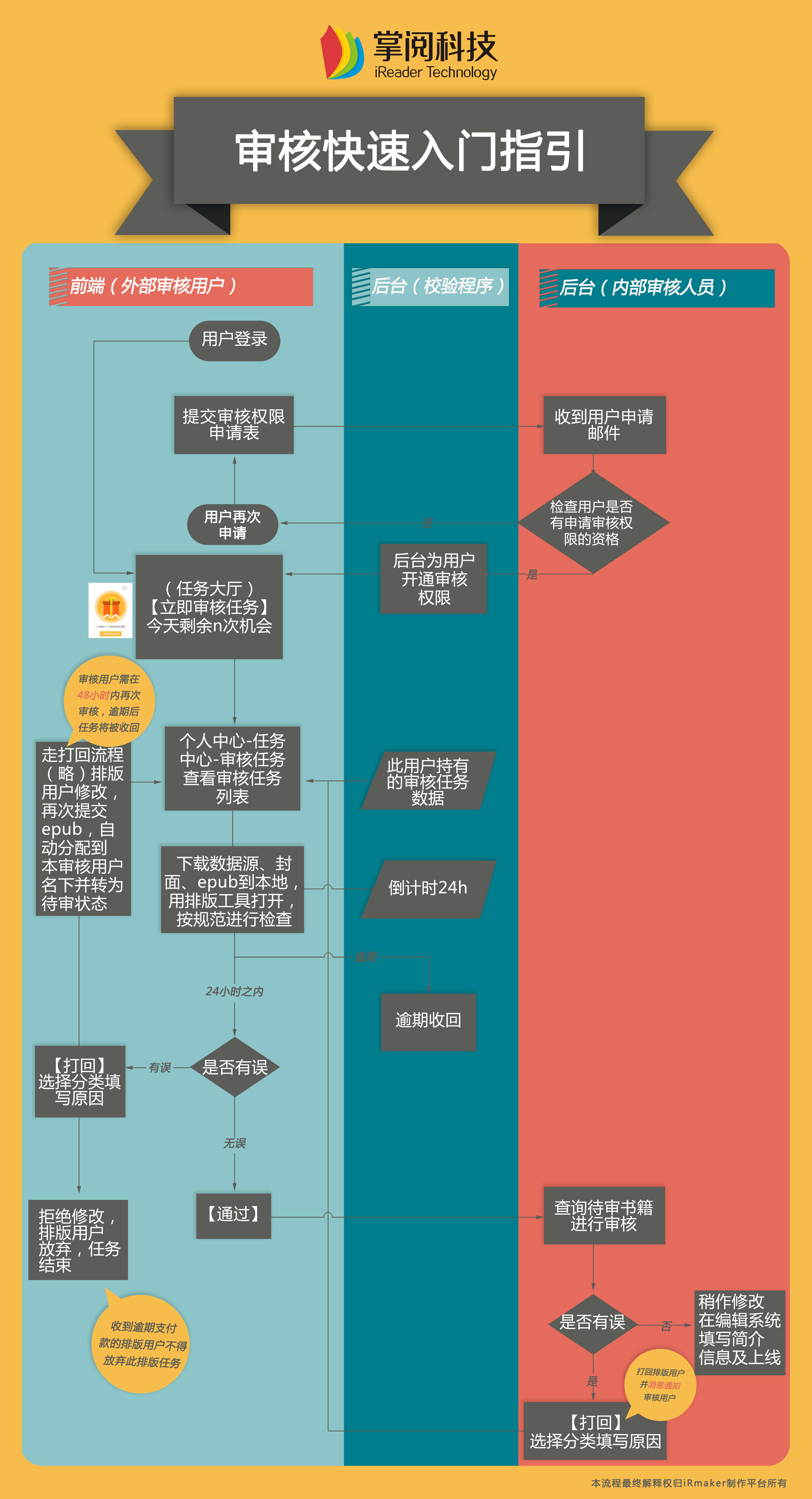 提交审核权限申请表→获得审核权限→后台工作人员开通审核权限,点亮“审核身份”→领取审核任务→审核通过→书籍上线→结账<div align=center></div>