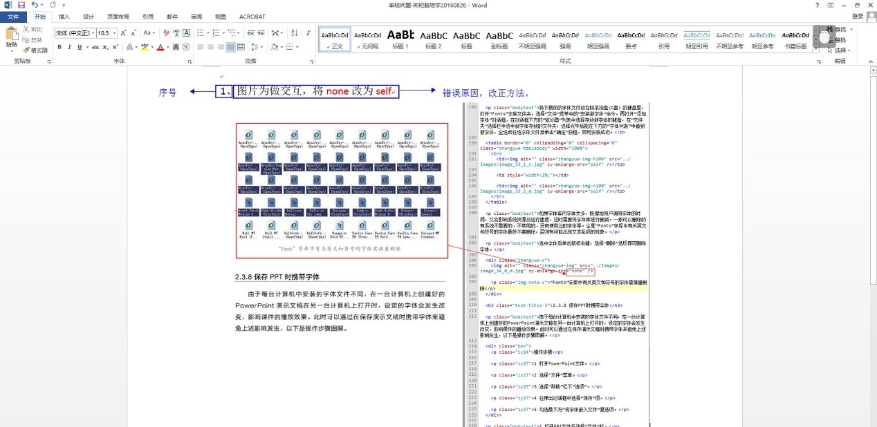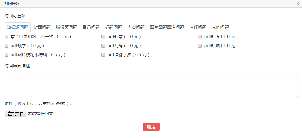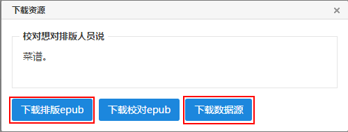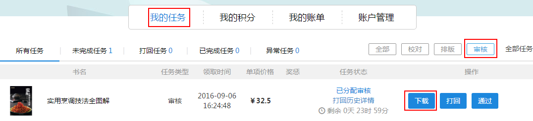###### 在首页处点击“任务大厅”↓ <div align=center></div> ###### 点击“立即领取审核任务” ↓ <div align=center></div> ###### 确认可领取剩余任务的数量,点击“确定”↓ <div align=center></div> ###### 在“我的任务”页-筛选出“审核”任务-点击任务书籍右侧“下载”数据源↓(此处注意所持任务的剩余完成时间) <div align=center></div> ###### 下载epub工程文件、数据源到本地↓ <div align=center></div> ###### 下载ePubGo工具 ePubGo下载及安装:`http://www.iremaker.com/college/course?articleType=layout#134&485` ###### 打开排版epub文件↓ <div align=center></div> ###### 按照审核规范对书籍排版进行审核,对于排版错误的问题,进行截图在word中写清楚问题原因,并压缩成zip格式的压缩包,方便打回时排版用户的查看。 1) Word规范 ① 序号、②错误原因、③改正方法、④截图并且将具体错误在文本栏和代码栏出分别标出;<div align=center></div> 2) 文件命名: 审核问题—XXXXX书名20160826(日期) <div align=center></div> 3) Word文档要压缩成zip格式文件,以便打回上传后方便排版用户修改 <div align=center></div> ###### 在任务栏中对书籍进行“打回”操作,在弹出的对话框中勾选清问题、对排版问题进行描述,上传zip压缩文件。 <div align=center></div>